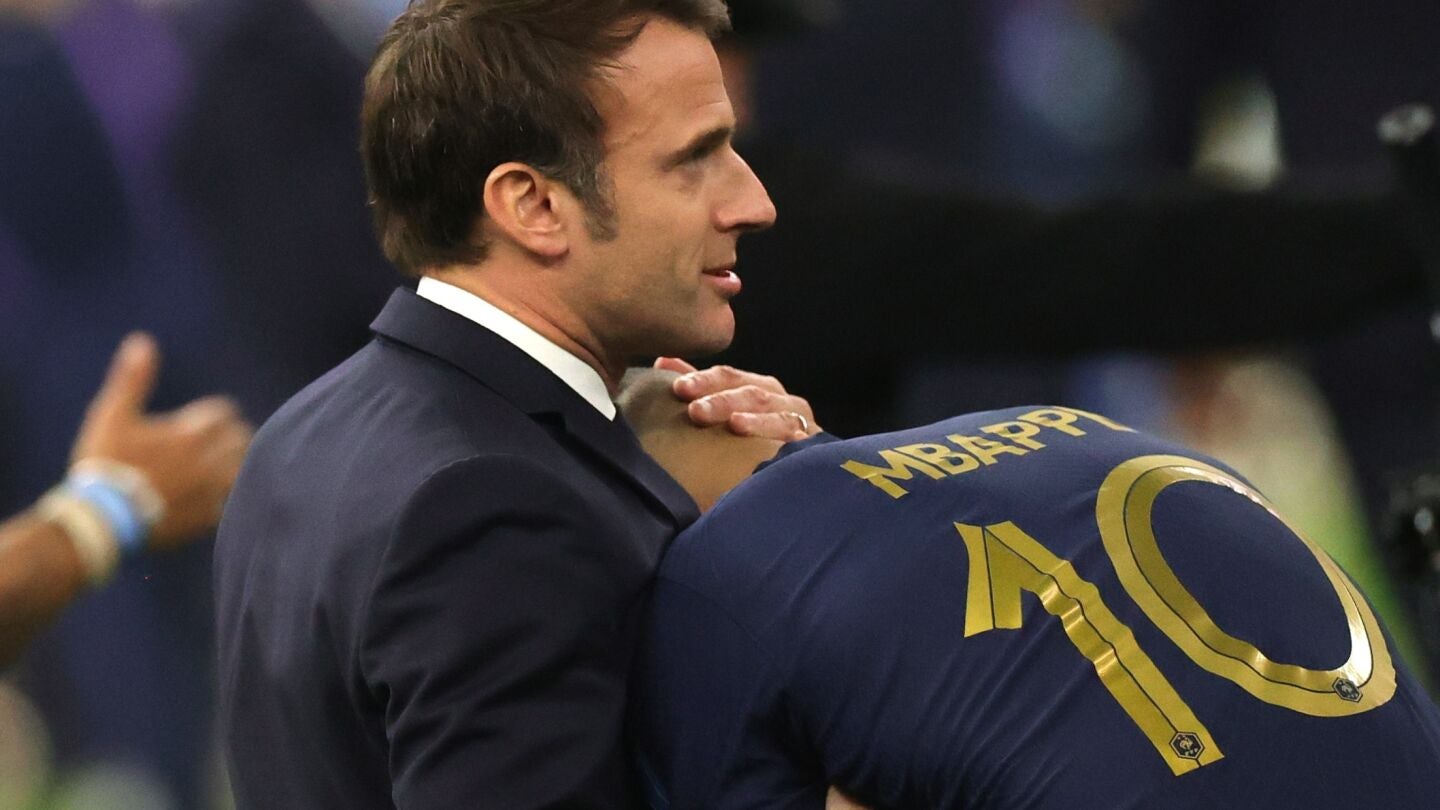 Emmanuel Macron, presidente de Francia, se fundió en un abrazo con Mbappé después de la derrota del país galo ante Argentina en el Mundial de Qatar,.