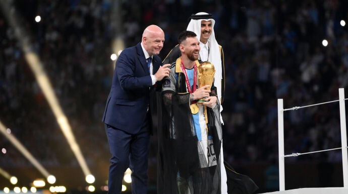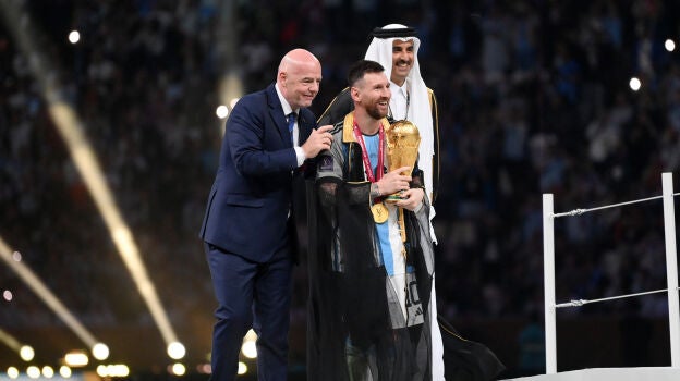 Tamim bin Hamad Al Thani, el emir de Qatar, y Gianni Infantino, presidente de la FIFA, fueron los encargados de colocarle el 'besht' a Messi.
