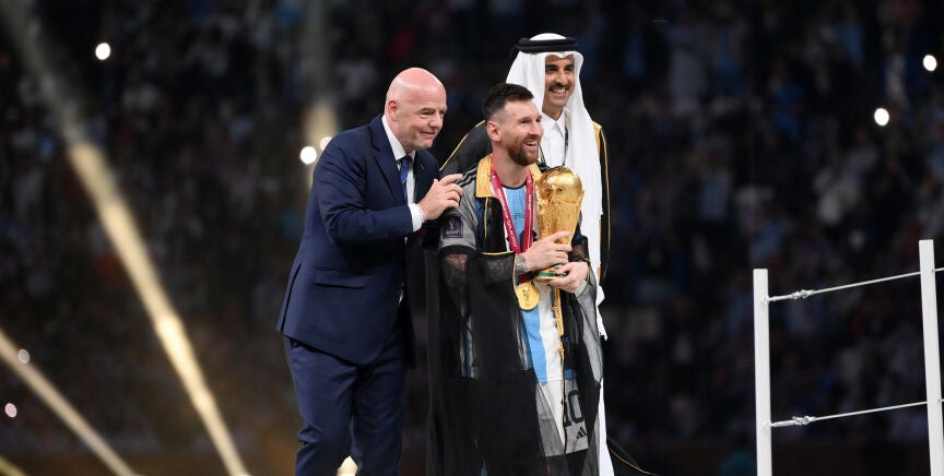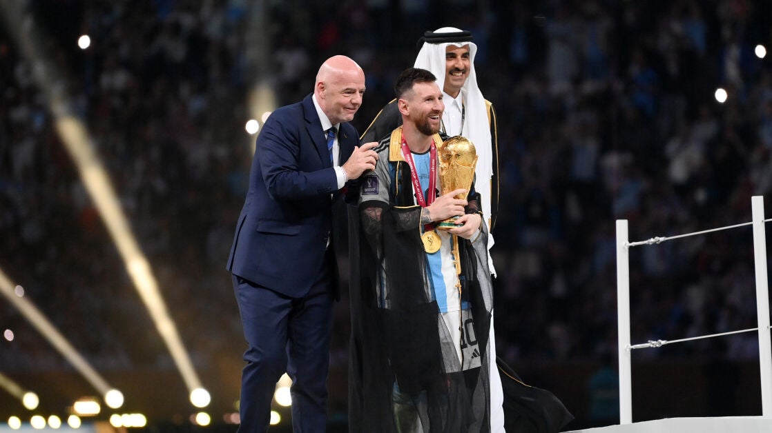 El emir de Qatar y Gianni Infantino ataviaron a Leo Messi con una llamativa túnica para levantar el título junto a sus compañeros.