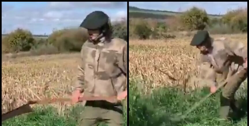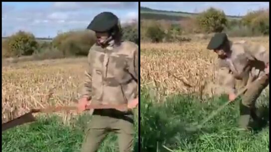 "Trabajando abdominales oblicuos", dice en un texto de Twitter para acompañar a un vídeo en el que se le ve cortando la mala hierba con una hoz.