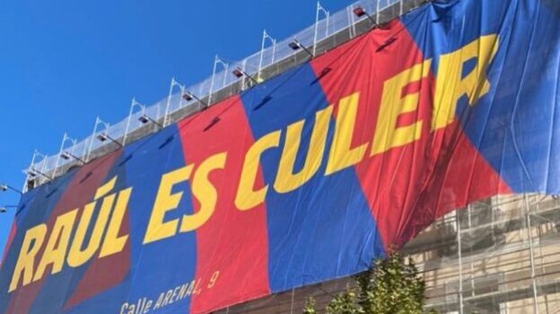 El F.C Barcelona ha abierto su primera tienda oficial en Madrid y el club culé ha usado una pancarta gigante con la frase "Raúl es culer" en su inauguración.