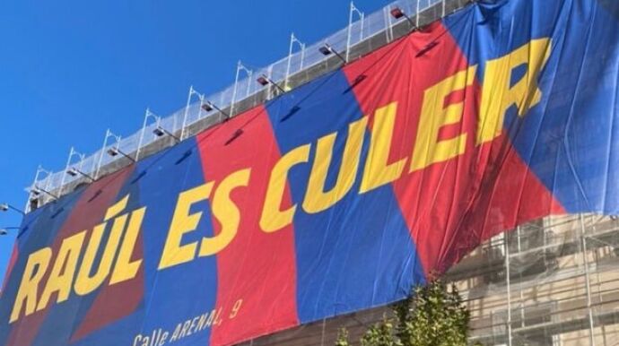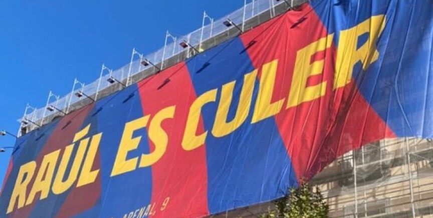 "Raúl es culer", dice la pancarta. Con ella, hacen referencia a Raúl González Blanco, uno de los mejores delanteros de la historia del Real Madrid y una leyenda del club blanco, que actualmente entrena al Castilla.