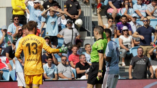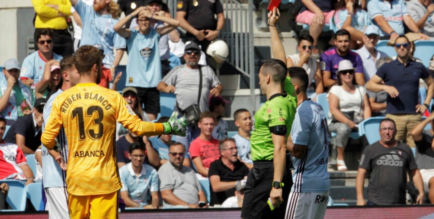 El capitán del Celta de Vigo, Hugo Mallo, se quejó del criterio arbitral por la expulsión de su compañero Jorge Sáenz a los diez minutos del partido de esta tarde contra el Valencia, y pidió a los estamentos arbitrales que cambien "cuanto antes" la nueva norma.