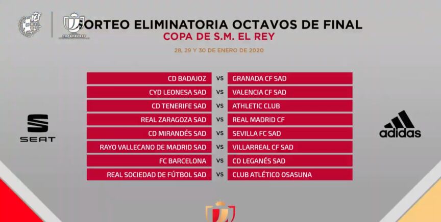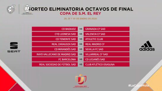 El sorteo de los ocatvos de final de la Copa del Rey ha deparado este viernes los cruces que se disputarán los días 28, 29 y 30 de enero.