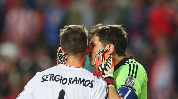 Sergio Ramos simplemente publicó una imagen de ambos, en la final de Lisboa en 2014. El beso de Casillas al central se convirtió en uno de los momentos más icónicos de la final. Posteriormente le dedicó unas palabras: "El fútbol te da las gracias a ti, amigo".