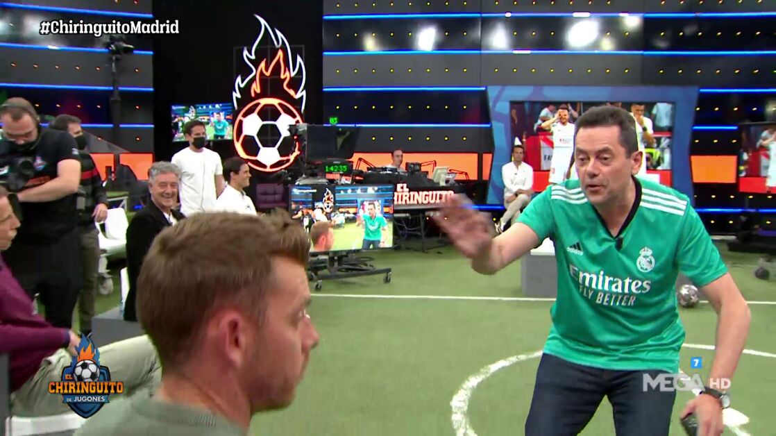 El colaborador madridista entró eufórico al plató de 'El Chiringuito' y entonó su nuevo 'hit' tras la remontada del Real Madrid al Sevilla.