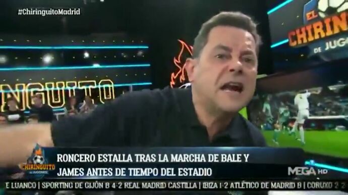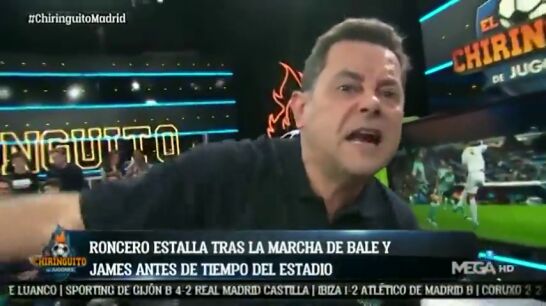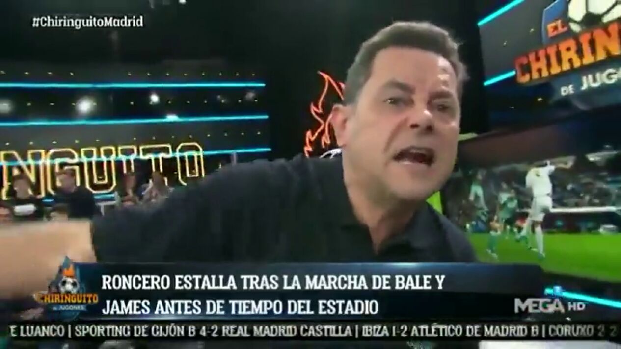 Pocas veces se ha visto a un Roncero tan enfadado como el que se vio en 'El Chiringuito' tras el empate del Real Madrid contra el Betis. El tertuliano no perdonó el gesto de Gareth Bale y James Rodríguez, que se marcharon antes de que acabase el encuentro.