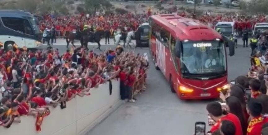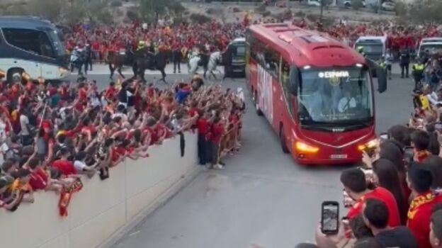 La afición española ha dejado una de las imágenes del fin de semana recibiendo de manera increíble a 'La Roja' en su llegada al estadio Enrique Roca de Murcia.