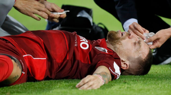 Antes del descanso llegó la segunda expulsión. En esta ocasión le tocó al Betis. Ya ganaban los béticos, con un autogol de Jesús Navas, cuando Fekir sacó el brazo ante el Papu Gómez.