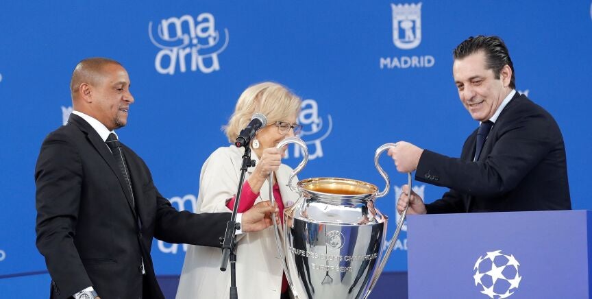Roberto Carlos y Futre entregan a Manuela Carmena el trofeo de la Champions League