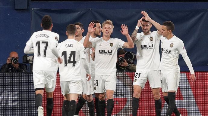 Dos goles en el tiempo añadido del Valencia ante el Villarreal (1-3) en el duelo español de los cuartos de final de la Liga Europa acercaron al equipo valencianista a las semifinales de la competición tras un partido igualado en La Cerámica.