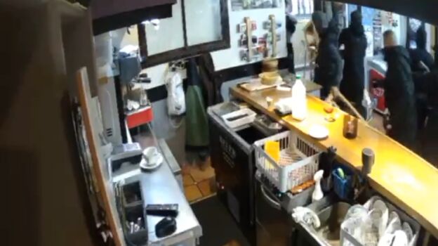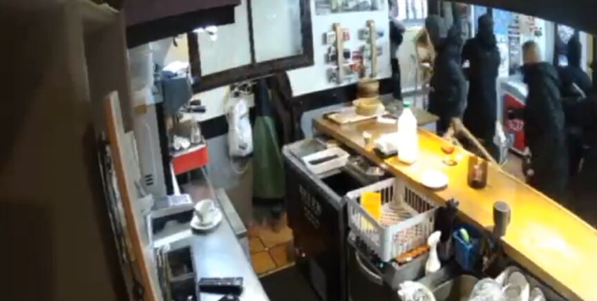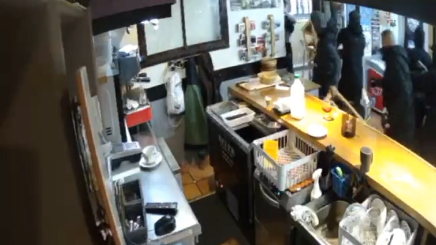 Primero, salió un metraje difundido por 'Navarra TV Deportes' desde el exterior en el que se veía cómo los ultras destrozaban los cristales del local con sillas e incluso tiraban una bengala encendida al interior. Todos los agresores iban encapuchados e iban armados con bates de béisbol y cuchillos.