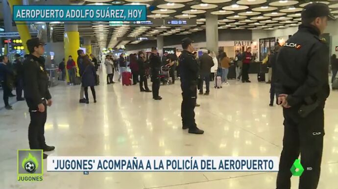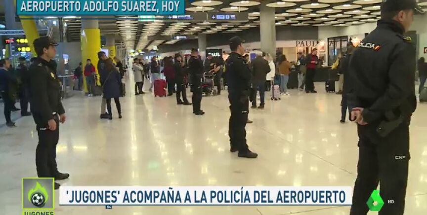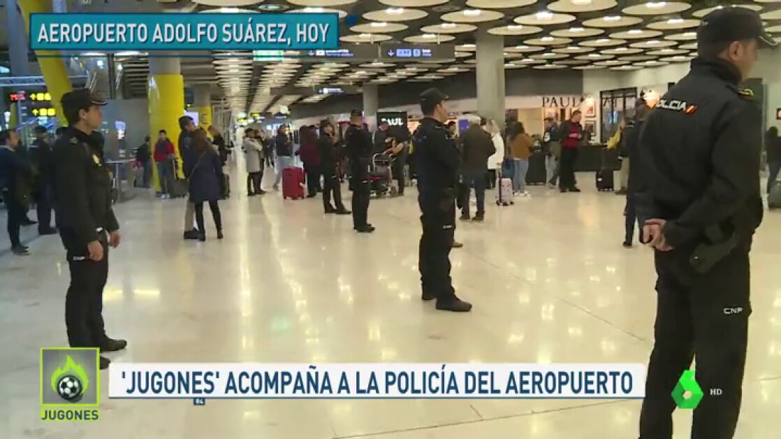 A primera hora de la mañana, agentes de la Policía Nacional acudían al aeropuerto Adolfo-Suárez para acompañar a los radicales del Ajax durante su estancia en Madrid. Jugones acompaña a los agentes en este dispositivo especial.