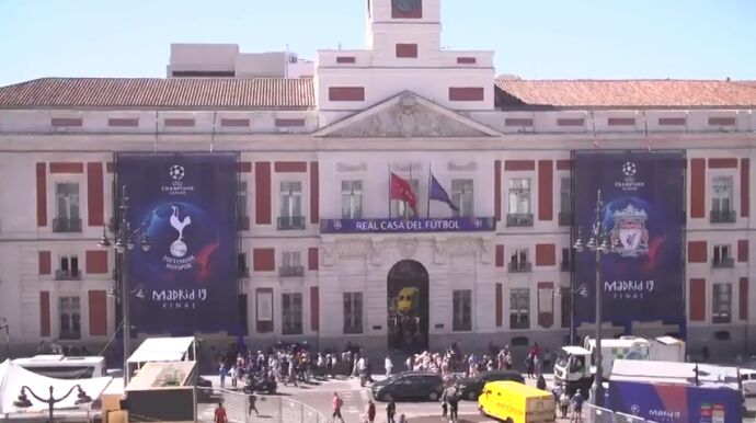 La Real Casa de Correos, sede del Gobierno de la Comunidad de Madrid, luce desde hoy en su fachada los escudos del Liverpool y el Tottenham, los clubes ingleses que el próximo sábado disputarán en el estadio Metropolitano la final de la Champions League.