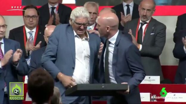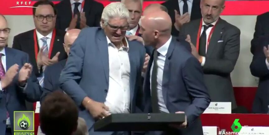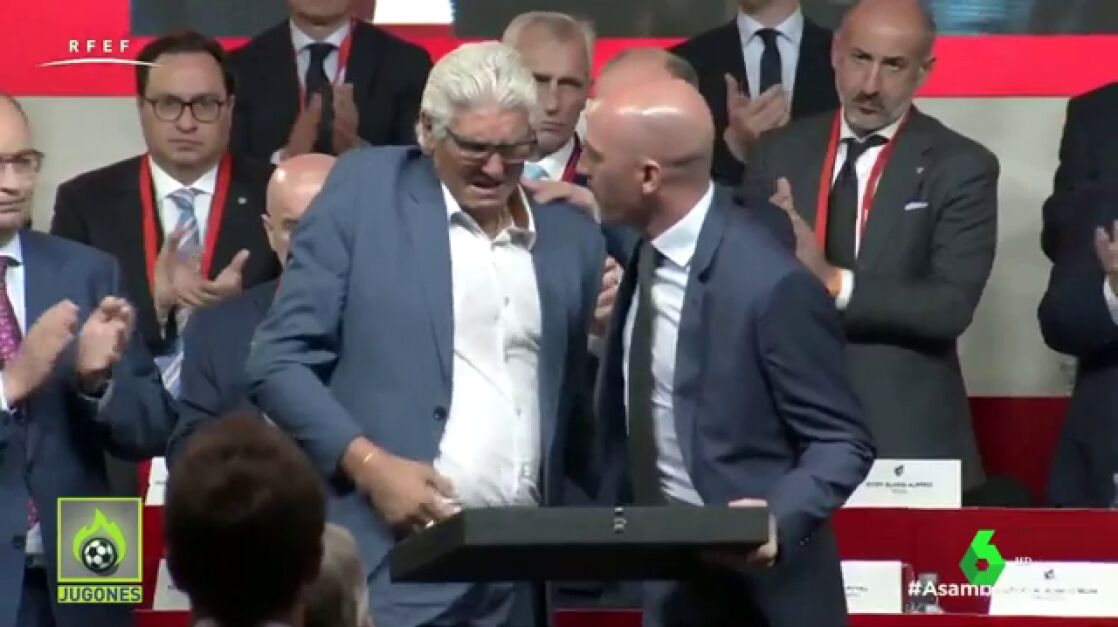 Tras la trágica muerte de Reyes, la RFEF ha entregado la insignia de oro y brillantes al exjugador del Sevilla. El padre de este subió a recogerla emocionado entre los aplausos de los asistentes.