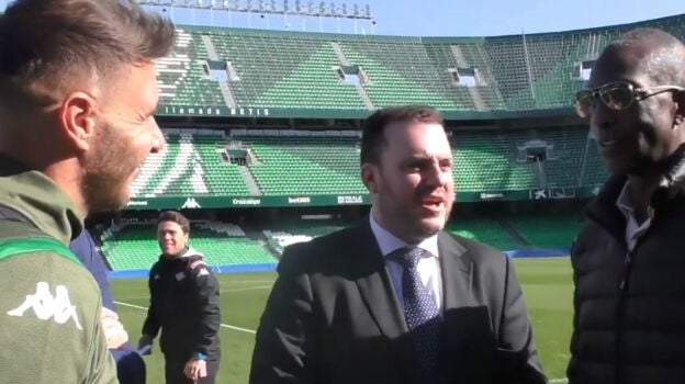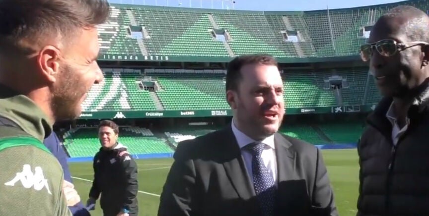Joaquín Sánchez ha sido la principal estrella en el Benito Villamarín, y eso que quien estaba junto a él no era ni más ni menos que el legendario Michael Johnson. El gaditano protagonizó un nuevo festival del humor con el exatleta y con el gancho de la traductora que con él estaba.
