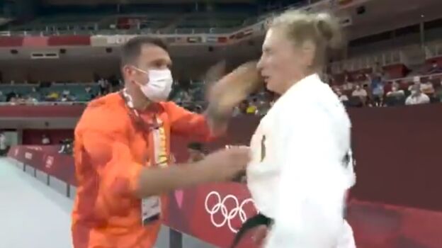 Esto es un calentamiento, en el sentido más gráfico de la palabra. La alemana Martyna Trajdos y su entrenador protagonizaron una de las imágenes de la jornada antes de subirse al tatami en el primer combate de la judoca en la modalidad de -63kg.