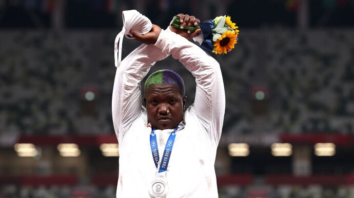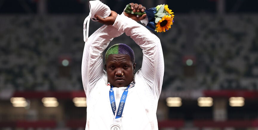 Esa es la infracción que ha cometido la estadounidense Raven Saunders y por la que puede ser sancionada. La lanzadora de peso consiguió la medalla de plata en su modalidad y una vez en el podio y con la medalla colgada se atrevió a levantar los brazos y cruzarlos en forma de 'X' haciendo un gesto que según la propia atleta "es un gesto en favor de todas las personas que están oprimidas".