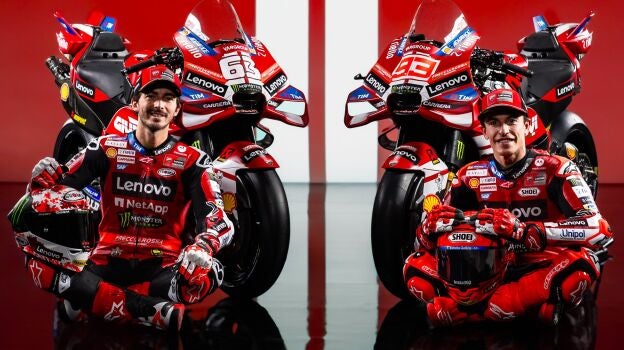 El fabricante italiano ha mostrado una moto roja y blanca, colores propios de Ducati, en la que ambos pilotos han posado con los nuevos monos que vestirán durante todo el año.