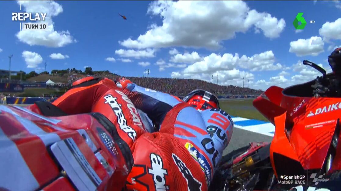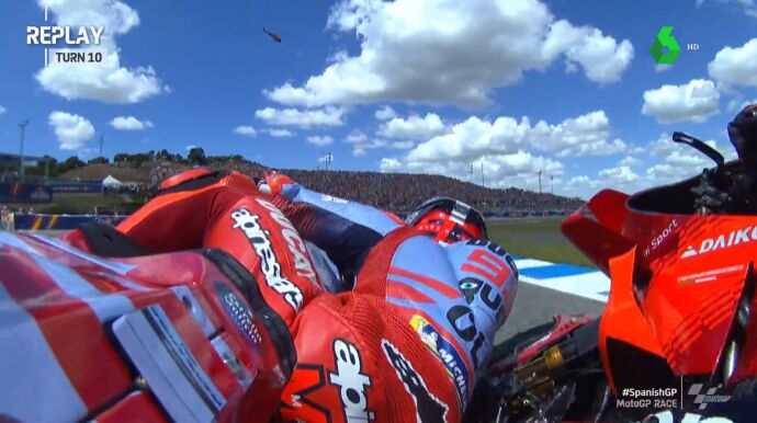 A falta de cinco vueltas para el final, llegó el momento más tenso. Bagnaia chocó contra Marc en una escena que recordó a lo ocurrido en Portimao hace un mes cuando ambos se fueron al suelo.