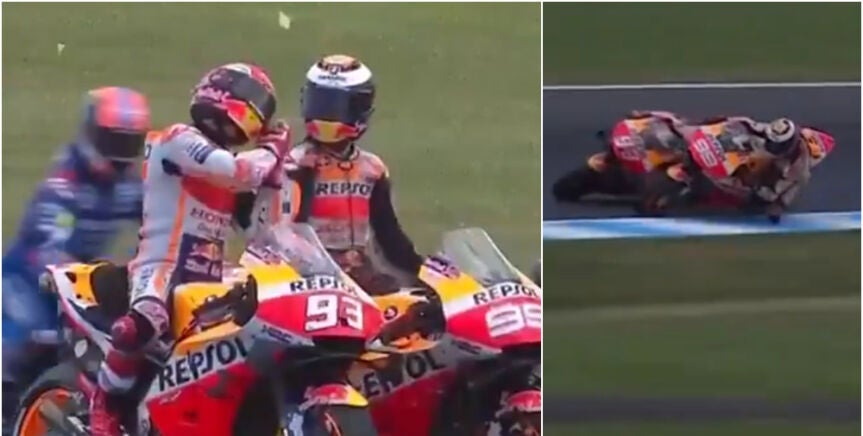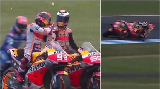 Marc Márquez no se relaja ni en los entrenamientos libres de un Gran Premio. El campeón del mundo iba en vuelta rápida en Phillip Island cuando se tocó con su compañero, Jorge Lorenzo, al que abroncó.