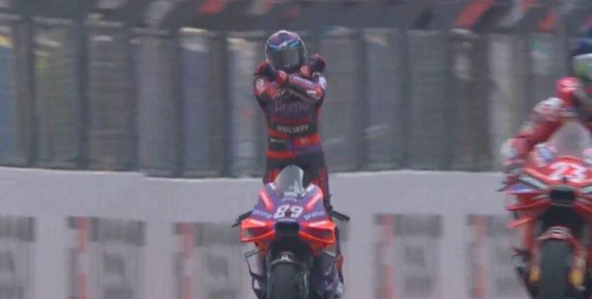 Una celebración que hemos visto cientos de veces en los terrenos de juegos por parte del portugués, pero que ahora se pasa a las motos gracias a la gran actuación de un Jorge Martín que no ha tenido oposición en Portugal.