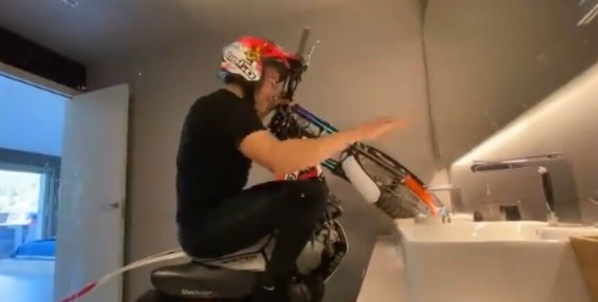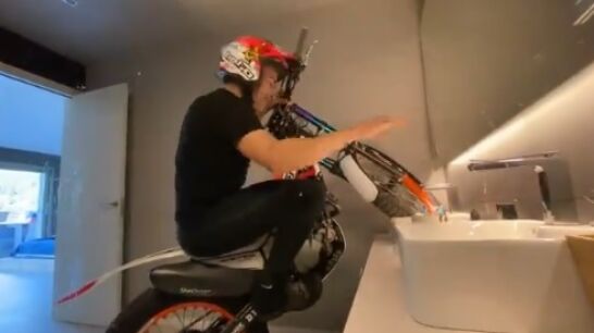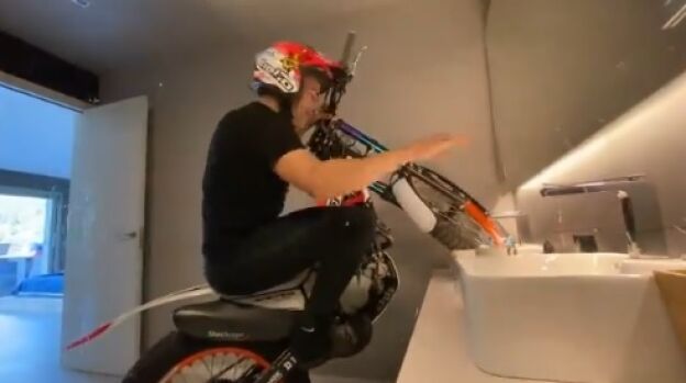 El 27 veces campeón del mundo de trial ha compartido un vídeo de cómo es su día a día. Una cuarentena surrealista. Encima de su moto se lava los dientes, acude al armario para vestise, se prepara el desayuno...