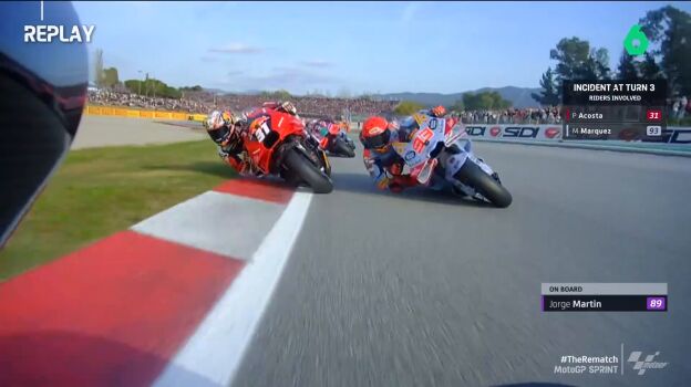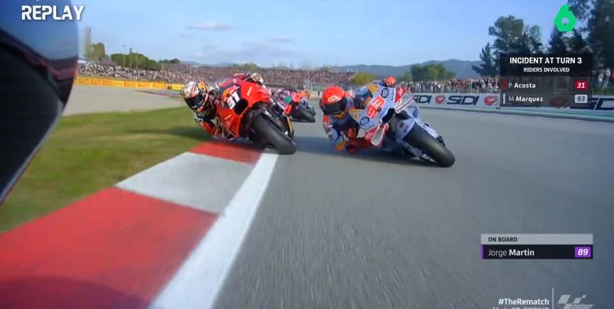 Pedro Acosta se quedó sin carrera después de su toque con Marc Márquez en la primera curva del Gran Premio de Barcelona. El de Gresini asumió su culpa... y después Acosta le dejó un 'dardito', acusándole directamente de haber provocado la colisión.