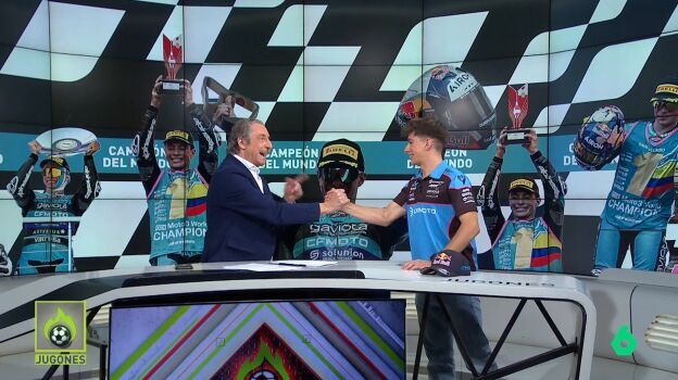 El campeón de Moto3 ha acudido al plató de 'Jugones' para presentar el programa de este lunes.