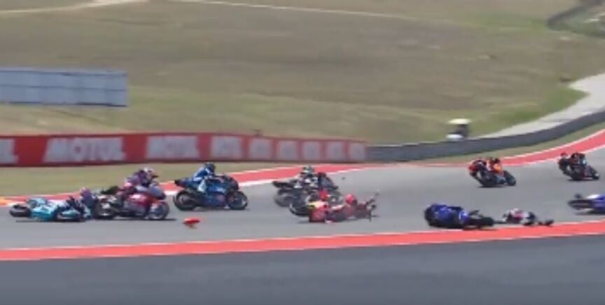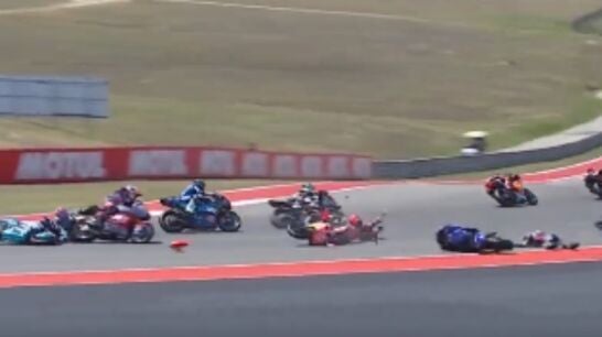 La carrera de Moto2 del Gran Premio de Las Américas ha estado marcada por un accidente escalofriante. En la primera vuelta, hasta siete pilotos se fueron al suelo después de un impacto múltiple brutal que, como no podía ser de otra forma, obligó a los comisarios a mostrar la bandera roja.