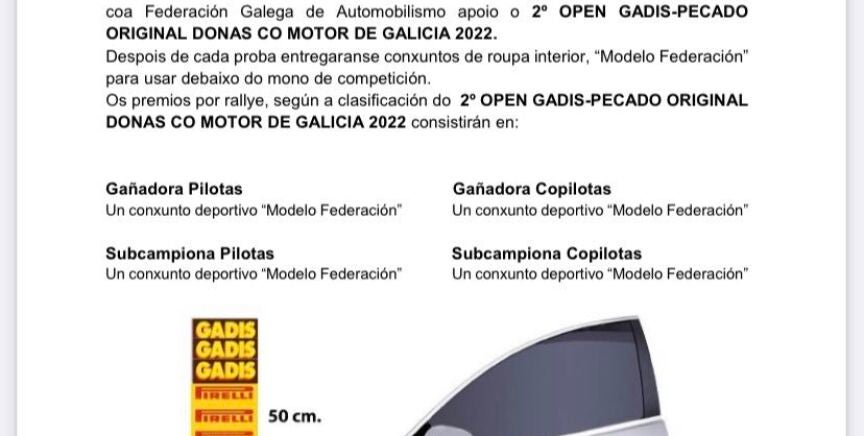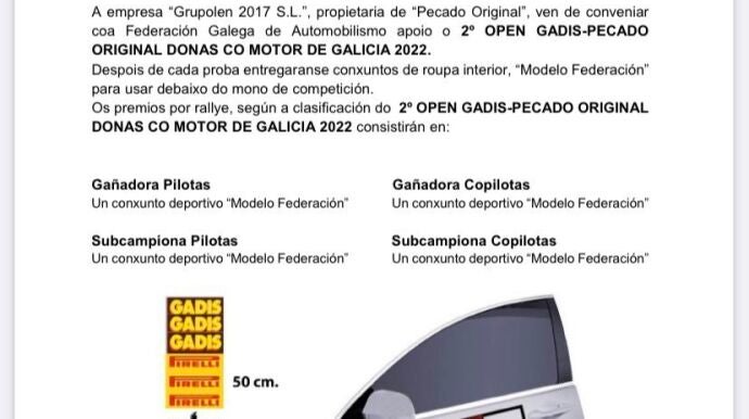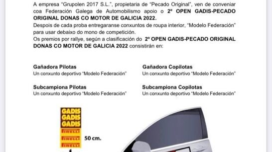"Ante la polémica surgida", la Federación Galega de Automobilismo defiende que "uno de los patrocinadores de la copa" era el "fabricante gallego de ropa femenina de marca Pecado Original", que comercializa prendas de "calidad e ignífugas aptas para la práctica del automovilismo deportivo".