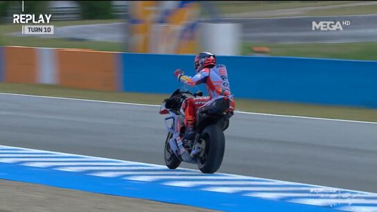Márquez llegaba al último sector batiendo el registro del sudafricano, pero la rueda delantera de su Ducati sobrepasó el límite del agarre. Sin embargo, el '93' logró evitar la caída en el último instante.