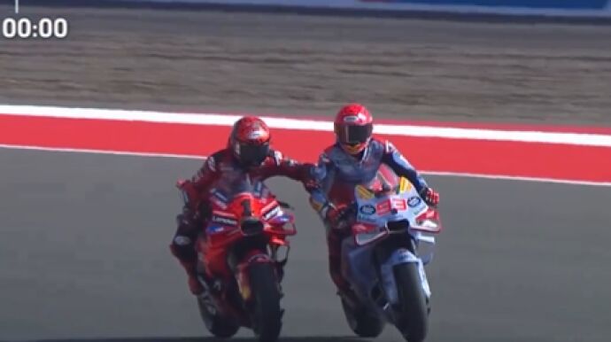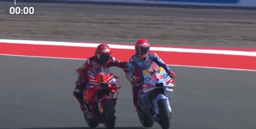 'Pecco' se había quedado sin gasolina y al verse en esa situación se ha agarrado al brazo del de Gresini para poder llegar al 'box' de Ducati sin tener que echar el pie a tierra. La imagen no va más allá de eso pero deja un bonito gesto del de Cervera con el que va a ser su compañero de equipo y rival por el mundial el año que viene.