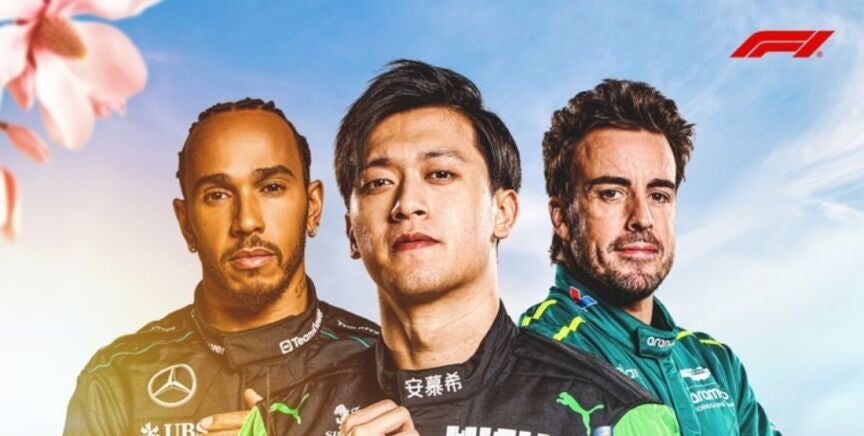 La Formula 1 ha publicado un cartel promocional del Gran Premio de China, que se disputará en en circuito de Shangai, y han elegido para encabezarlo con Zhou, Hamilton y Alonso, pero no a Verstappen...
