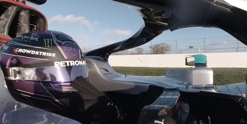 Primero se grabó cómo Lewis salía del garaje y pasaron de esconder cualquier mínimo detalle con unos planos brutales que hacen ver cómo se verá un coche de 2022.