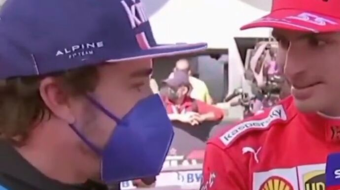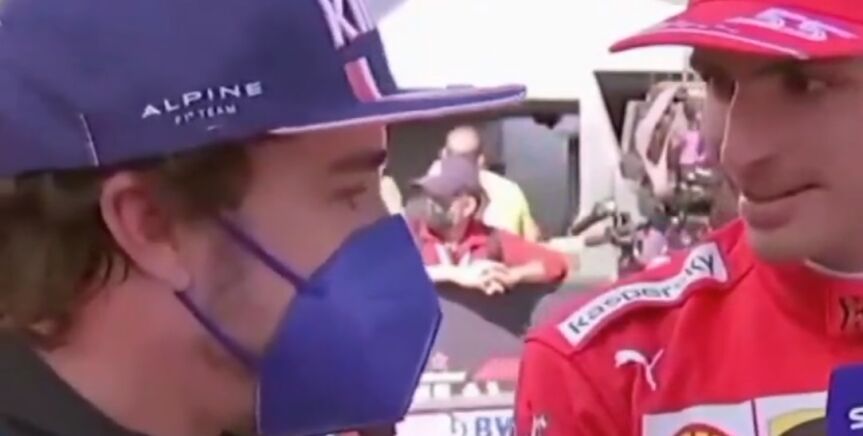 Ya finalizada la carrera, en la ronda de entrevistas, se vivió un curioso momento entre Fernando Alonso y Carlos Sainz. Mientras al madrileño le preguntaban en 'Sky Sports', el asturiano interrumpió a su compatriota para 'unirse'... pero como entrevistador.