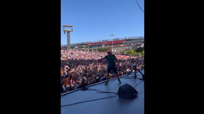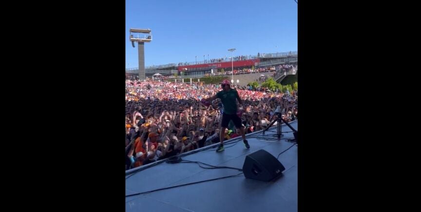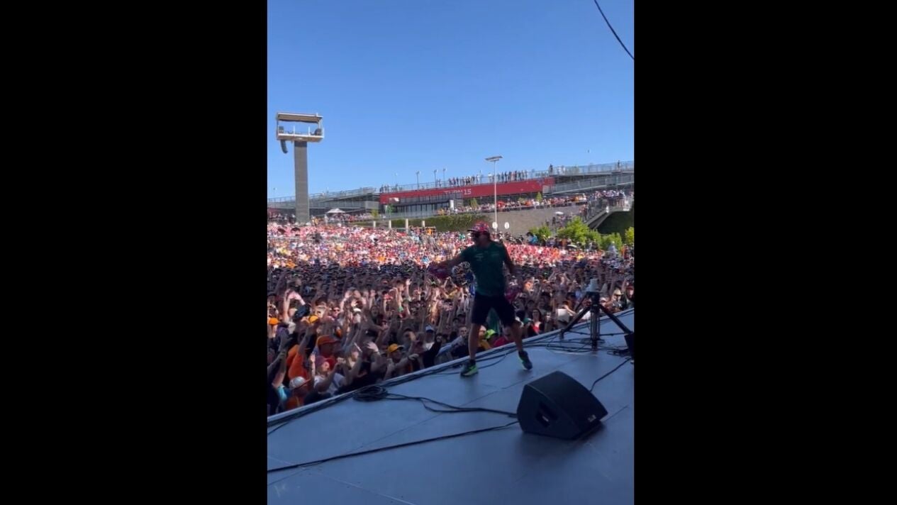 Aston Martin ha compartido el momento en el que Alonso se 'transformó' en estrella del rock. Sobre un escenario, Fernando levantó los aplausos y el griterío de la afición de la Fórmula 1... con un lanzamiento de gorras.