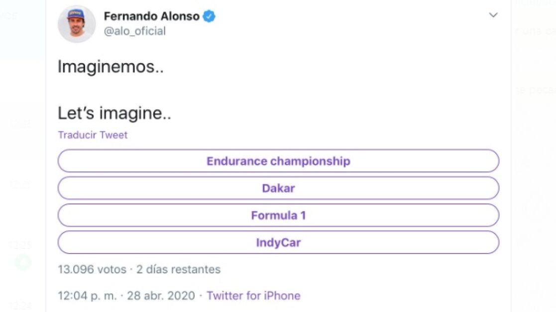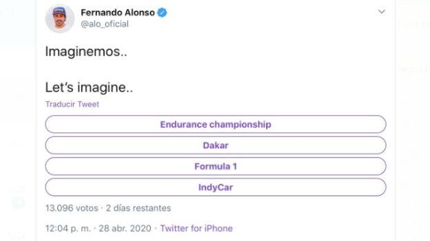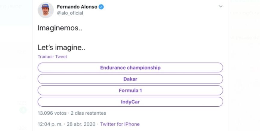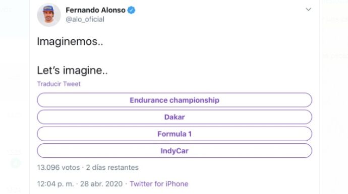 Alonso ha publicado en su perfil de Twitter una encuesta, bajo el título "Imaginemos", con cuatro competiciones: el Campeonato Mundial de Resistencia de la FIA (FIA World Endurance Championship), el Rally Dakar, la Fórmula 1 y la IndyCar.