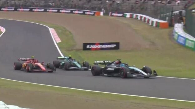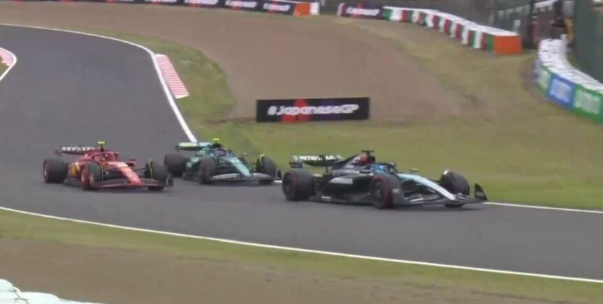 Durante los últimos minutos de los Libres 1, Fernando Alonso decidió iniciar un adelantamiento a Carlos Sainz en las enlazadas de Suzuka, a lo que el madrileño respondió apretando el acelerador. Justo delante estaba George Russell, quien sería la siguiente víctima de Fernando...