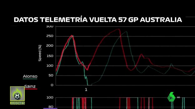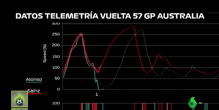 La gráfica demuestra que ambos aceleran de forma parecida hasta que sucede lo inevitable. Este es el dato que utiliza ahora Ferrari para devolver un cuarto puesto que a Sainz le quitaron los comisarios.