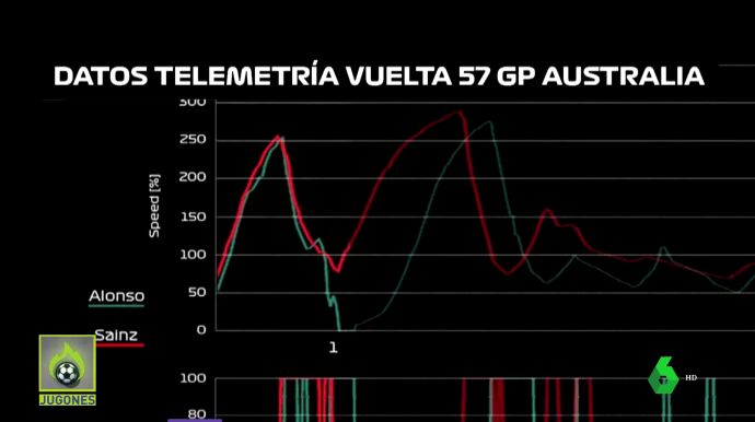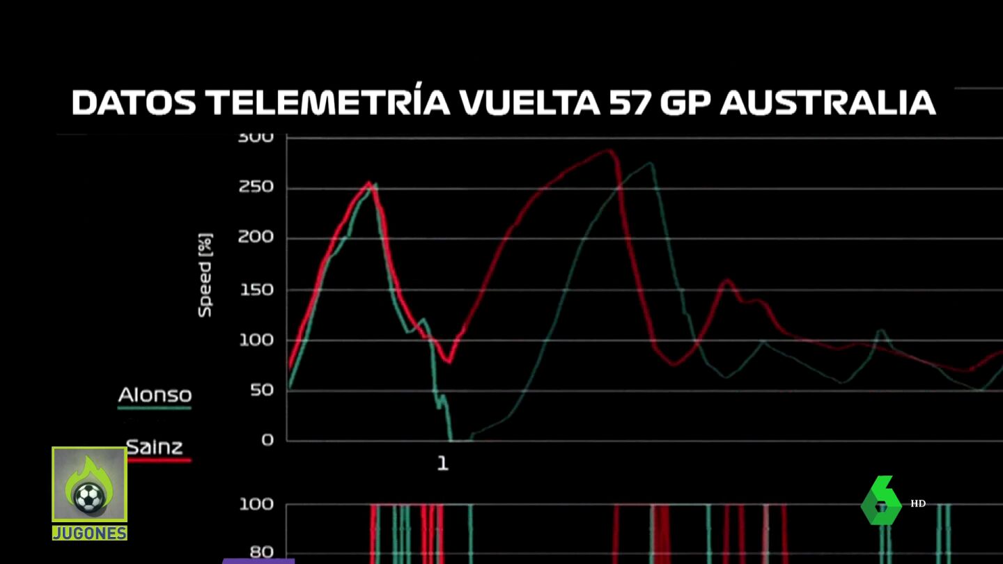 En la imagen que acompaña a esta noticia, se puede ver la telemetría de Sainz y Alonso. En verde, la del Aston Martin; en rojo, el Ferrari. A llegar a esa curva es Sainz el que frena primero. Lo que quiere es evitar el choque ante todo.
