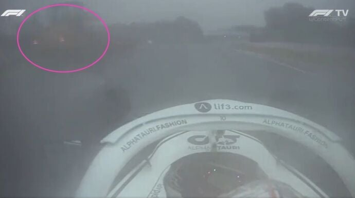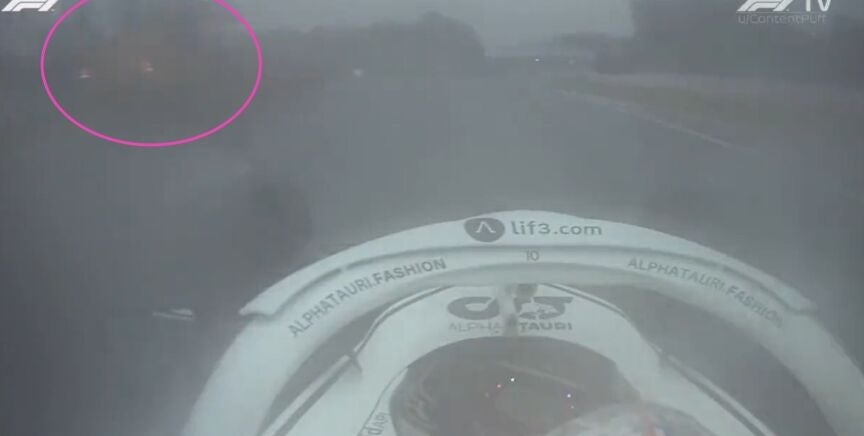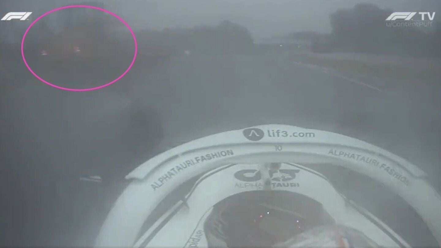 En las imágenes se ve, más o menos por la cantidad de lluvia que había en pista, cómo el AlphaTauri pasa a prácticamente nada de una grúa que trataba de llevarse a uno de los coches parado en la pista.