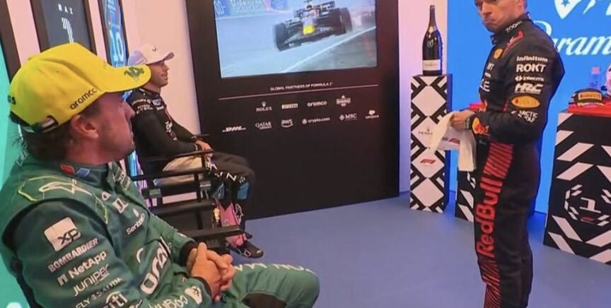 Dicha acción sorprendió a los aficionados que estaban viendo la carrera y también ha sorprendido a Max Verstappen. Antes de subir al podio, el neerlandés estaba viendo junto a Fernando Alonso y Pierre Gasly la repetición de las mejores acciones de la carrera, y al ver la arrancada del español, alucinó.