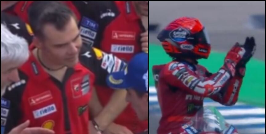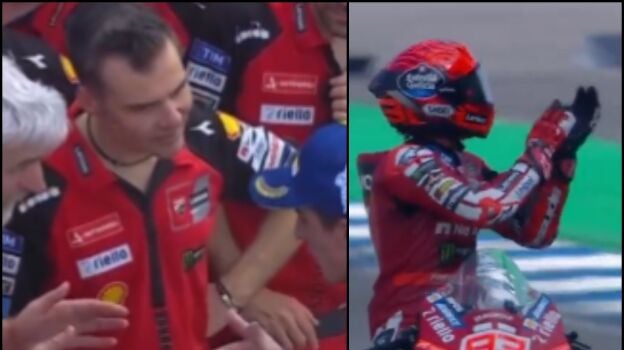 Tras finalizar la carrera en segunda posición, el vigente campeón 'aplaudió' de manera irónica a los comisarios por la decisión tomada y no se le vio con cara de buenos amigos al finalizar la prueba. En el 'corralito' donde se colocan los tres primeros clasificados de la 'sprint', se pudo ver a Marc analizando la acción con Gigi Dall'igna, jefe de Ducati.