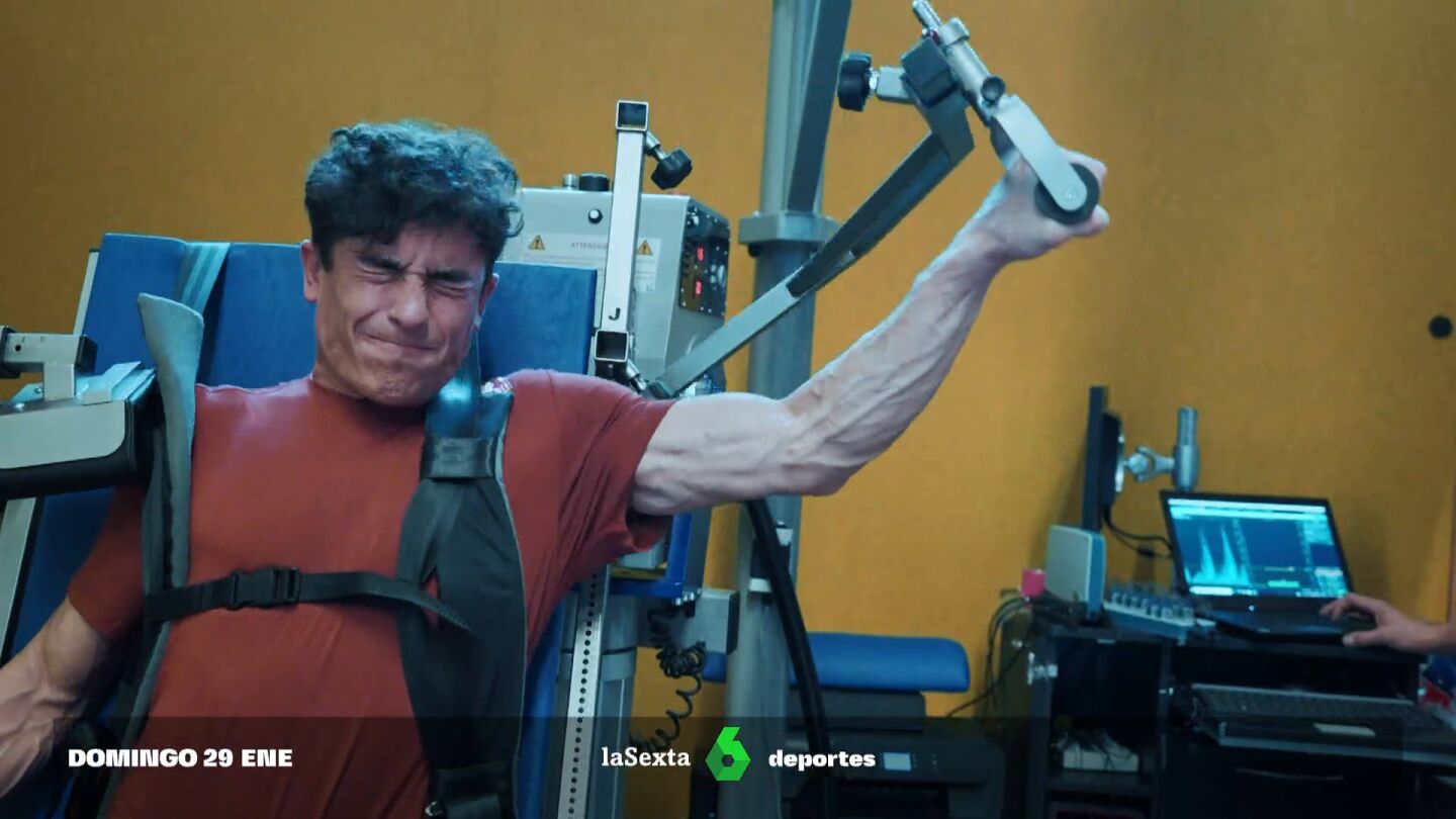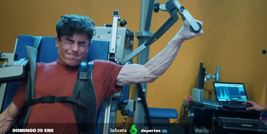 Su cara denota esfuerzo, y sus músculos están en completa tensión. Tal es la fuerza que realiza que las venas se le pueden ver con total claridad.
