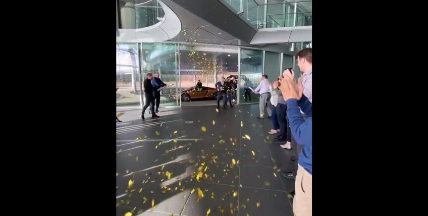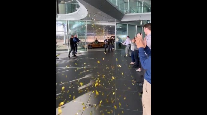 La escudería británica donde corre su hijo, Carlos Sainz Jr, le ha organizado una bienvenida sorpresa en su visita con confeti y con todos los trabajadores esperándole para felicitarle.
