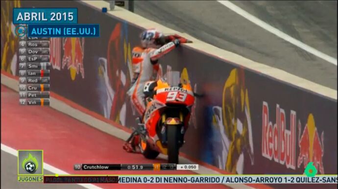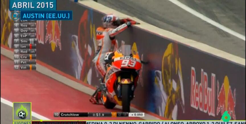 Era abril 2015, Jorge Lorenzo lideraba la clasificación y Marc dejó su moto para saltar el muro a falta de 3 minutos para terminar la sesión.