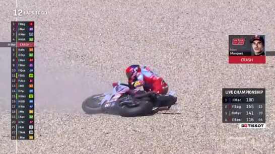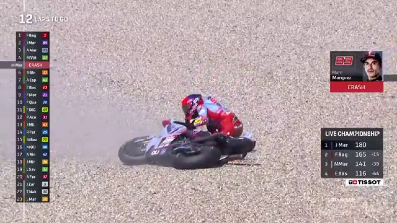 Marc Márquez sumó su primer adiós en una sprint en este 2024. El catalán pisó el piano de la curva 2 y perdió por completo el control de su Ducati para irse a la grava.