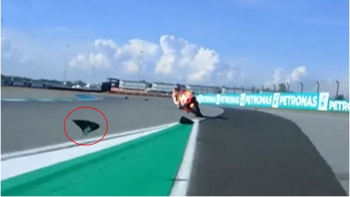 Cuando Jorge Martín iba a entrar al pit lane, una aleta de la rueda delantera de su moto salió por los aires e impactó en el hombro derecho de Marc Márquez, zona en la que se ha sometido a cuatro operaciones.