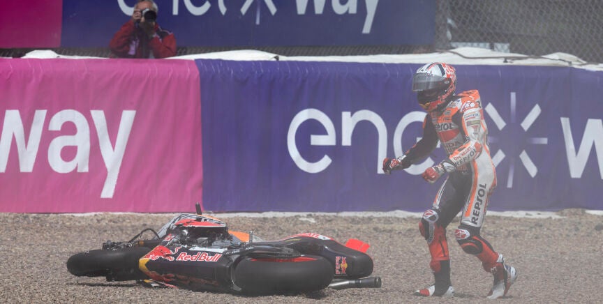 Marc Márquez arriesgó en su último intento y volvió a caerse, esta vez en la primera curva, el mismo punto en el que el viernes sufrió la aparatosa caída con la que se llevó puesto a Johann Zarco, por lo que no fue capaz de mejorar su tiempo, y saldrá desde la séptima posición tanto en la carrera al sprint como en la carrera larga del domingo.